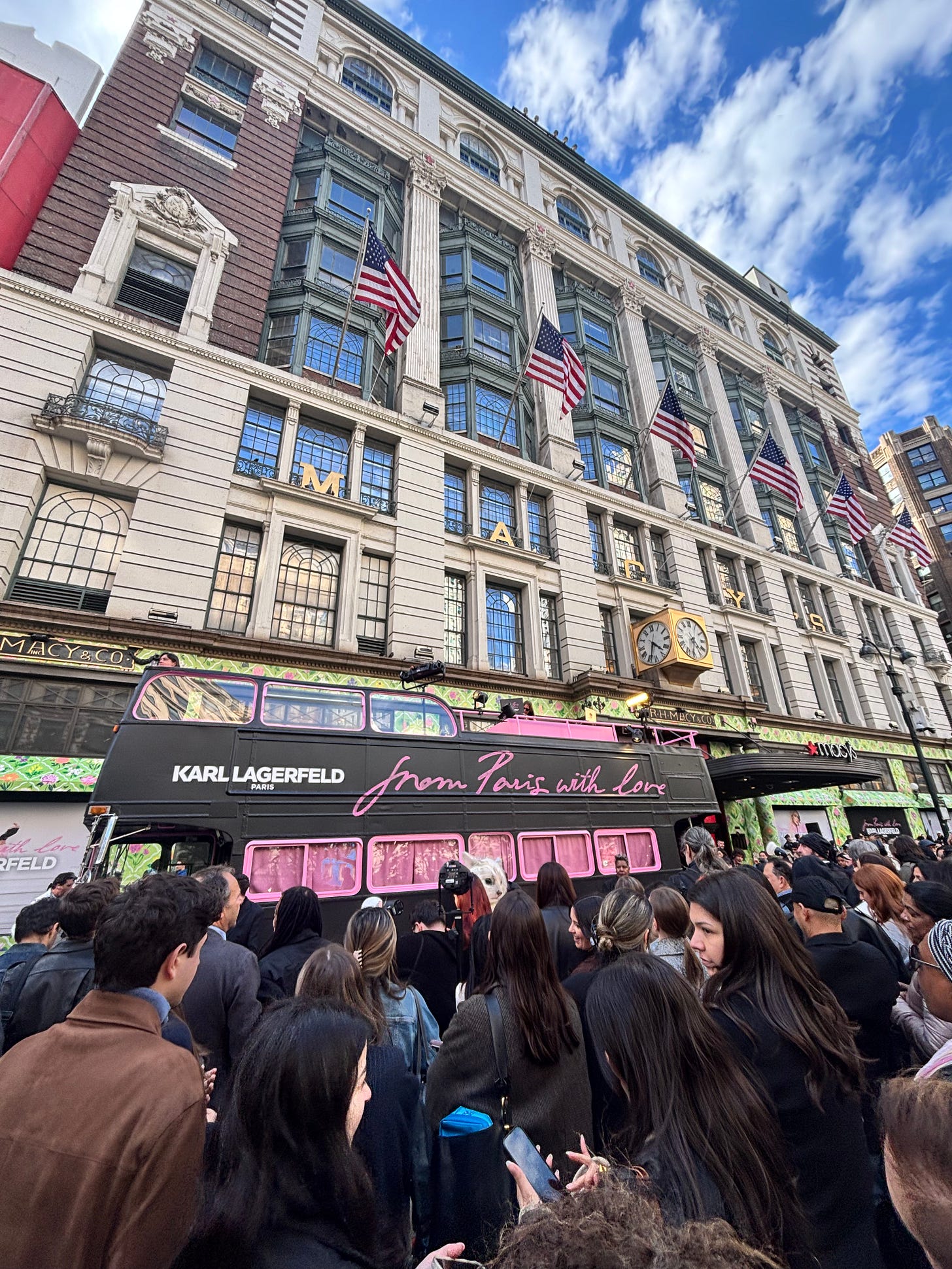 We exited the subway and headed to Herald Square, but were definitely not greeted by a Parisian backdrop (actually, no one greeted us at all). I’d imagined stepping into the Marais — accordion music, champagne, croissants. Instead, the press were packed like sardines into a cordoned-off pen, with the public hovering behind us.