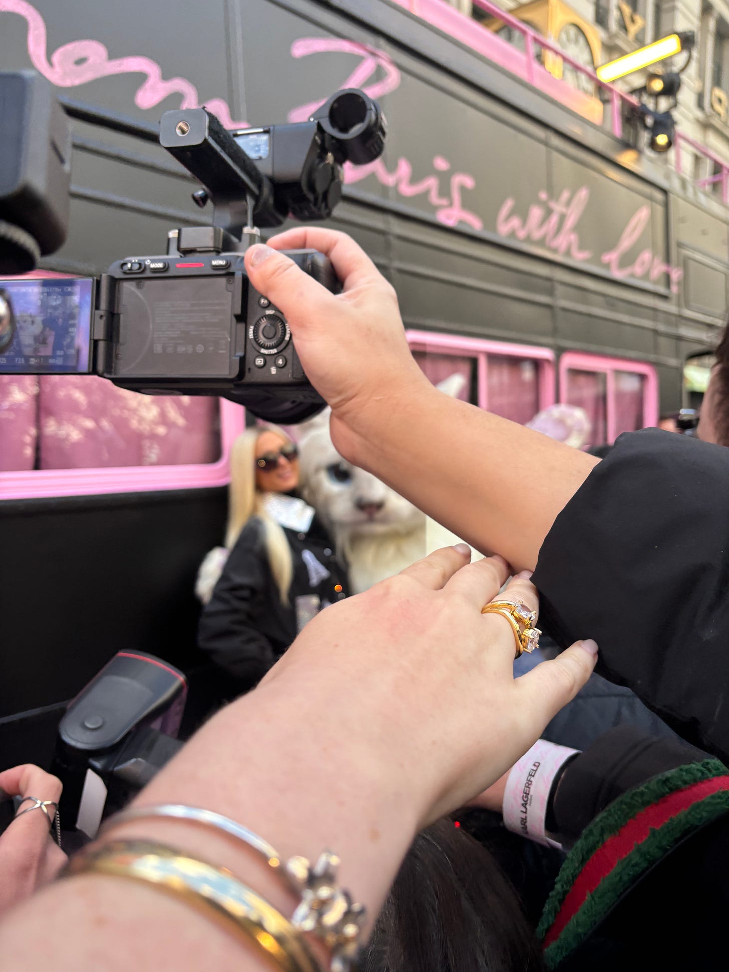 And in the place of the Eiffel Tower, we got a tour bus, a pink runway, and a life-size Choupette.